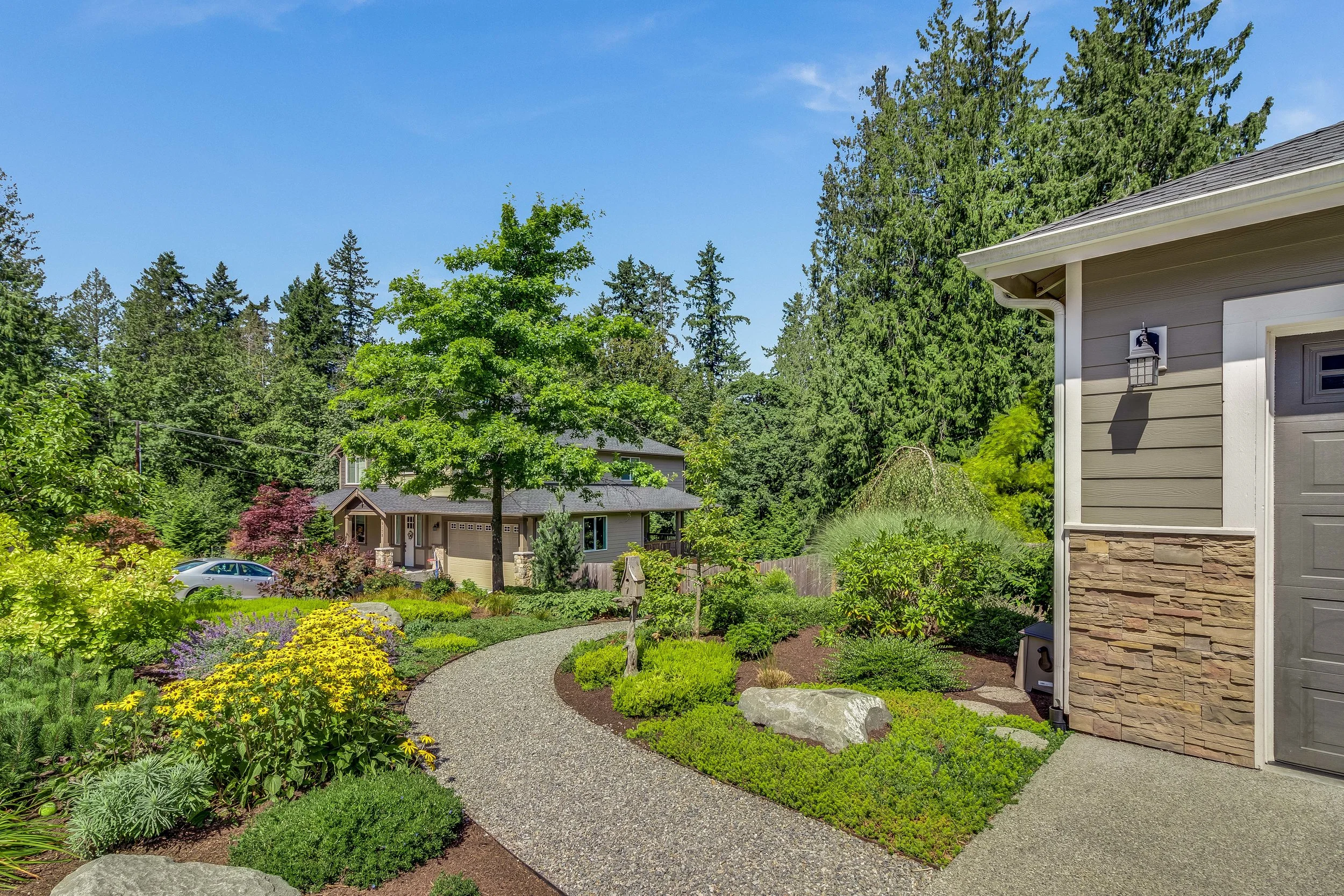 The backyard oasis offers a park-like setting with beautiful gardens, water feature, and brand new playground. Only minutes from town and the ferry with public beach access for you to enjoy nearby!