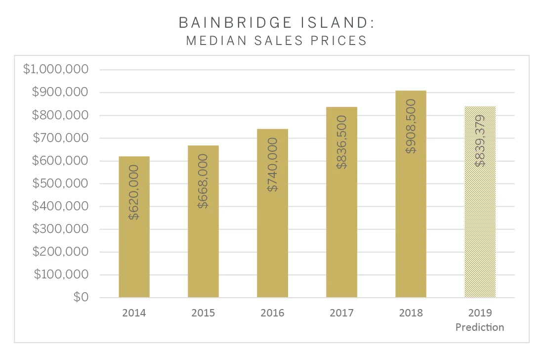 The median residential price on Bainbridge Island rose at a compound annual growth rate of 10.0 percent from 2014 through 2018. In 2019, a modest decline of less than eight percent is forecast.